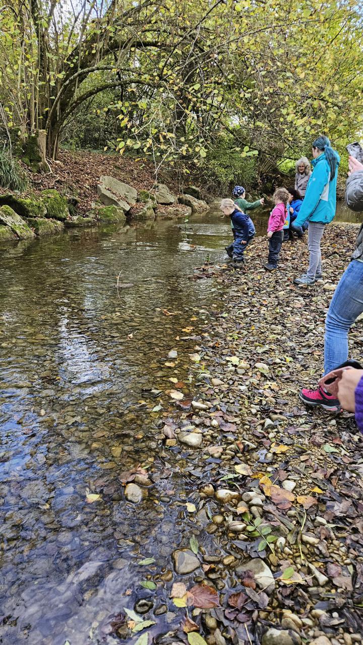 Anschliessend ziehen wir gemeinsam zum nahen Fluss. Dort testet ihr eure Naturschiffe im Wasser. Ihr beobachtet, wie sie in der Strömung fahren und wir führen ein kleines Wettrennen durch. So erlebt ihr, was ein Schiff schwimmen lässt, wie Strömung funktioniert und wie wichtig Achtsamkeit im und am Wasser ist.